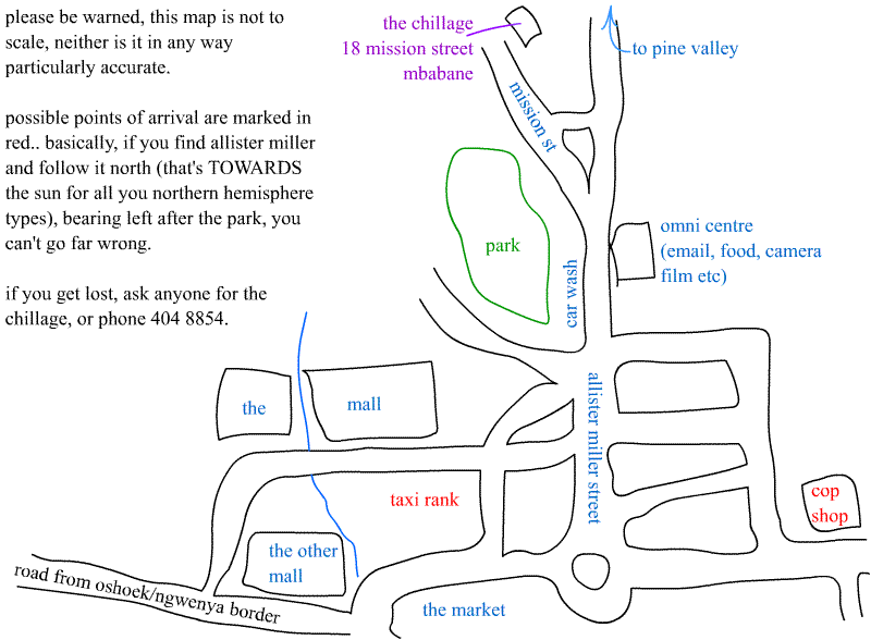 The Chillage is just North of the centre of Mbabane. It's easy to walk but if
